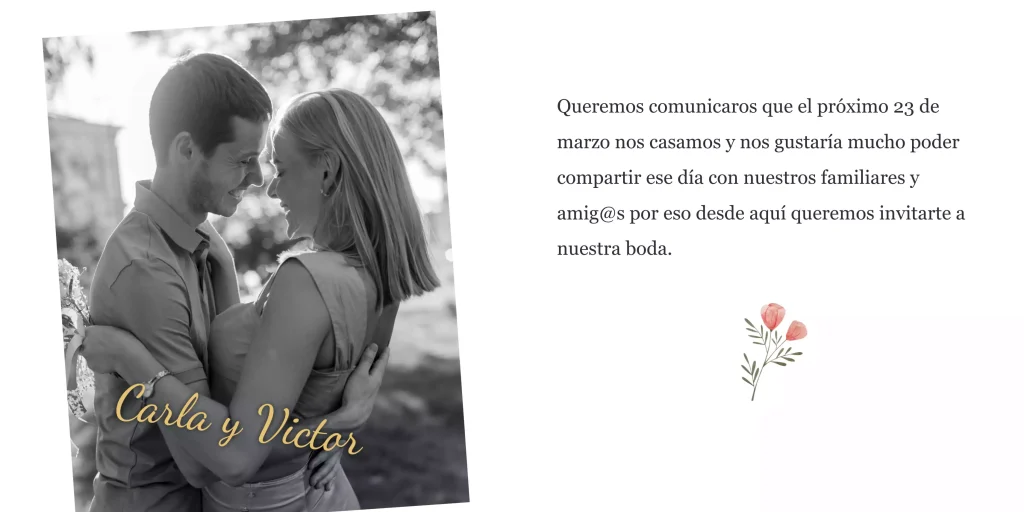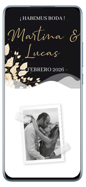 Diseñamos invitaciones a boda en formato digital que tus invitados podrán ver tanto en el móvil como en el ordenador. Una forma más fácil de hacer llegar la invitación de vuestro enlace a todos vuestros invitados. En estas invitaciones para bodas podréis poner toda la información necesaria para vuestros invitados, desde el lugar y la fecha hasta el servicio de transporte privado o la confirmación de asistencia.