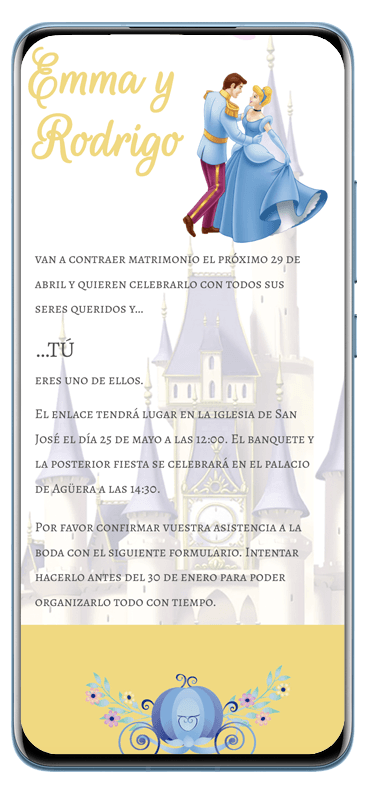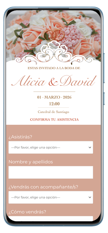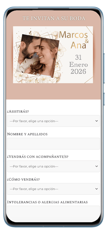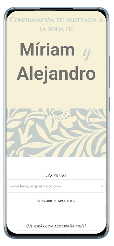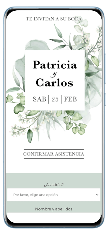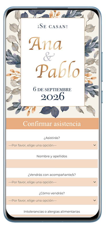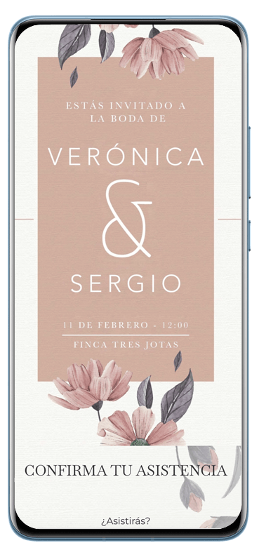 Elige un diseño de confirmación de asistencia de nuestro catálogo y nosotros nos encargamos de personalizarlo con vuestros nombres, fecha y foto. Listo para compartir con vuestros invitados.