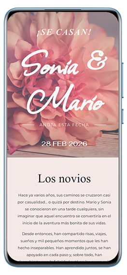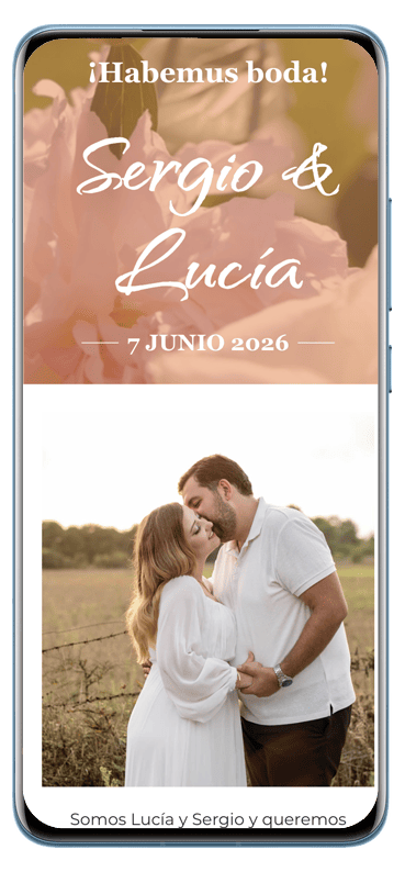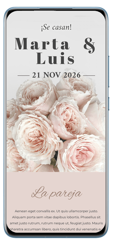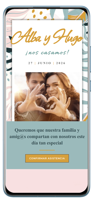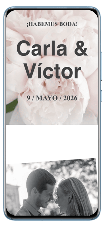Elige un diseño de invitación de boda entre nuestros más de 35 diseños profesionales y nosotros nos encargamos de personalizarlo con vuestros nombres, fotos, confirmación de asistencia, fecha y todos los detalles de vuestra boda, listo para compartir con vuestros invitados.