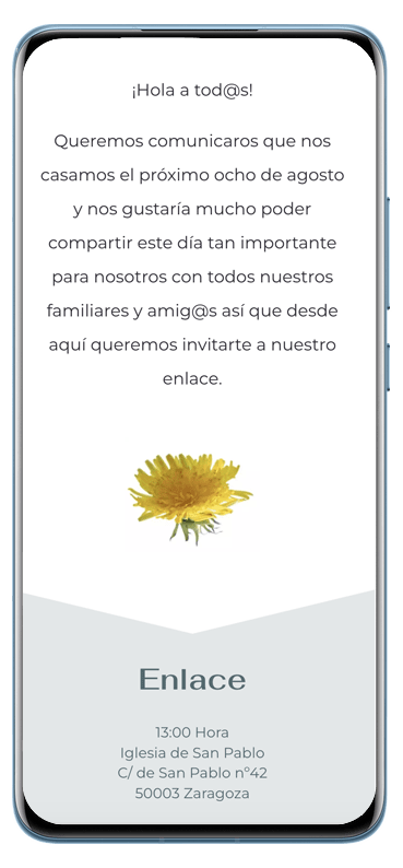 De todas maneras con la invitación de boda online se incluye un archivo digital con el enlace a la invitación, que podréis enviar por whatsapp o cualquier otra app o correo electrónico.