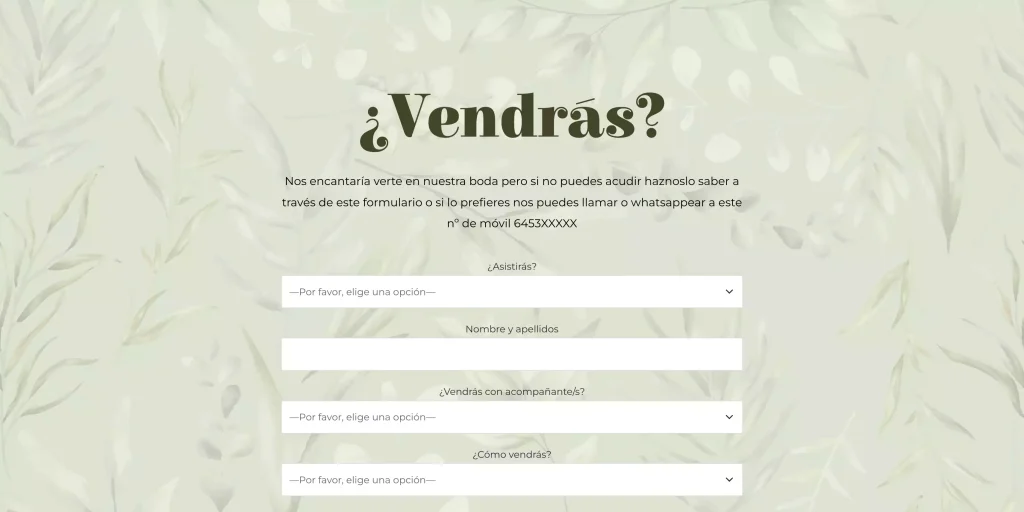 Las invitaciones digitales tienen una sección de confirmación de asistencia online en la que vuestros invitados podrán comunicaros su asistencia a parte de otras cuestiones como si utilizarán el autobús para invitados o si tienen alguna intolerancia alimentaria.